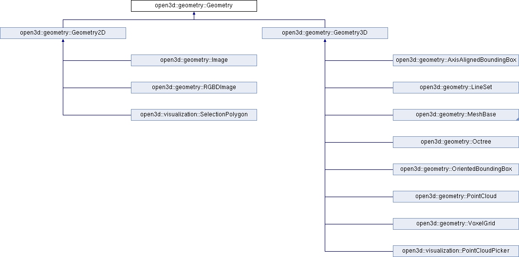 Implemented in open3d::geometry::Octree, open3d::geometry::AxisAlignedBoundingBox, open3d::geometry::Image, open3d::geometry::VoxelGrid, open3d::geometry::MeshBase, open3d::geometry::OrientedBoundingBox, open3d::geometry::PointCloud, open3d::geometry::LineSet, open3d::visualization::SelectionPolygon, open3d::geometry::RGBDImage, open3d::geometry::Geometry3D, open3d::geometry::Geometry2D, and open3d::visualization::PointCloudPicker.