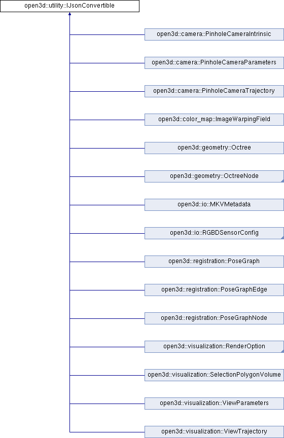 Implemented in open3d::geometry::Octree, open3d::geometry::OctreeColorLeafNode, open3d::visualization::RenderOption, open3d::geometry::OctreeInternalNode, open3d::registration::PoseGraph, open3d::visualization::ViewTrajectory, open3d::camera::PinholeCameraIntrinsic, open3d::registration::PoseGraphEdge, open3d::visualization::ViewParameters, open3d::visualization::SelectionPolygonVolume, open3d::io::AzureKinectSensorConfig, open3d::visualization::RenderOptionWithEditing, open3d::color_map::ImageWarpingField, open3d::registration::PoseGraphNode, open3d::io::MKVMetadata, open3d::camera::PinholeCameraParameters, and open3d::camera::PinholeCameraTrajectory.