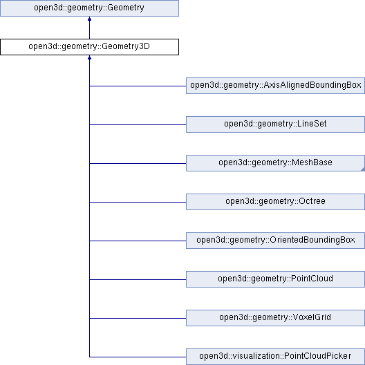 Implemented in open3d::visualization::PointCloudPicker, open3d::geometry::VoxelGrid, open3d::geometry::PointCloud, open3d::geometry::Octree, open3d::geometry::MeshBase, open3d::geometry::LineSet, open3d::geometry::AxisAlignedBoundingBox, and open3d::geometry::OrientedBoundingBox.