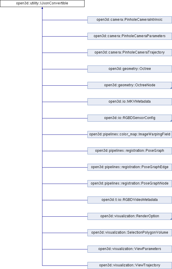 Implemented in open3d::visualization::ViewTrajectory, open3d::visualization::ViewParameters, open3d::visualization::RenderOptionWithEditing, open3d::visualization::RenderOption, open3d::visualization::SelectionPolygonVolume, open3d::t::io::RGBDVideoMetadata, open3d::t::io::RealSenseSensorConfig, open3d::pipelines::registration::PoseGraph, open3d::pipelines::registration::PoseGraphEdge, open3d::pipelines::registration::PoseGraphNode, open3d::pipelines::color_map::ImageWarpingField, open3d::io::MKVMetadata, open3d::io::AzureKinectSensorConfig, open3d::geometry::Octree, open3d::geometry::OctreePointColorLeafNode, open3d::geometry::OctreeColorLeafNode, open3d::geometry::OctreeInternalPointNode, open3d::geometry::OctreeInternalNode, open3d::camera::PinholeCameraTrajectory, open3d::camera::PinholeCameraParameters, and open3d::camera::PinholeCameraIntrinsic.