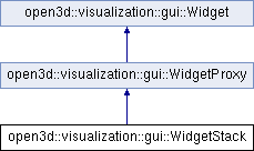 WidgetStack, like WidgetProxy, delegates at most one widget. Unlike WidgetProxy, it maintains multiple widgets. It saves all widgets pushed into by SetWidget and always shows the top one. The WidgetStack is a subclass of WidgetProxy, in another word, the topmost widget will delegate it self to WidgetStack. PopWidget will remove the topmost widget and callback set by SetOnTop taking the new topmost widget will be called. The WidgetStack disappears in GUI if there is no widget in stack.