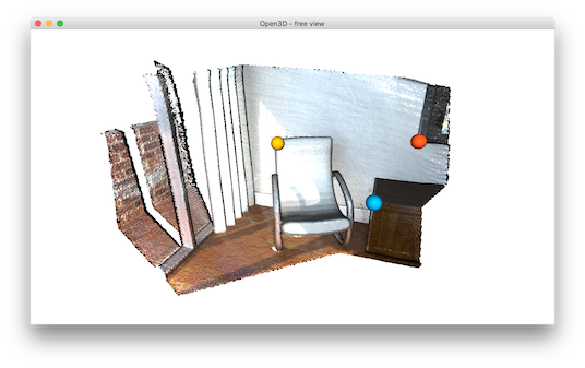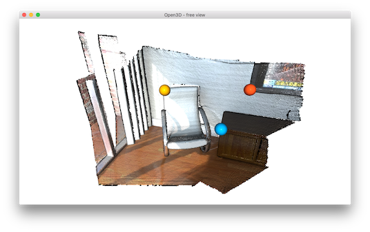 To pick a vertex, press shift + left click on a window. If a vertex is selected, the visualizer window overlays a sphere on a selected vertex. For example, after picking three vertices in the source point cloud, it shows: